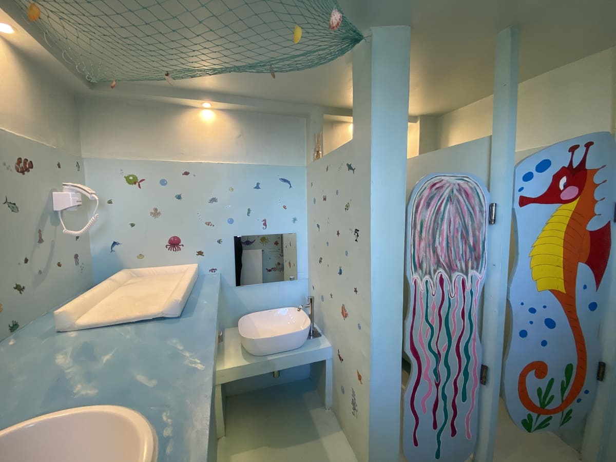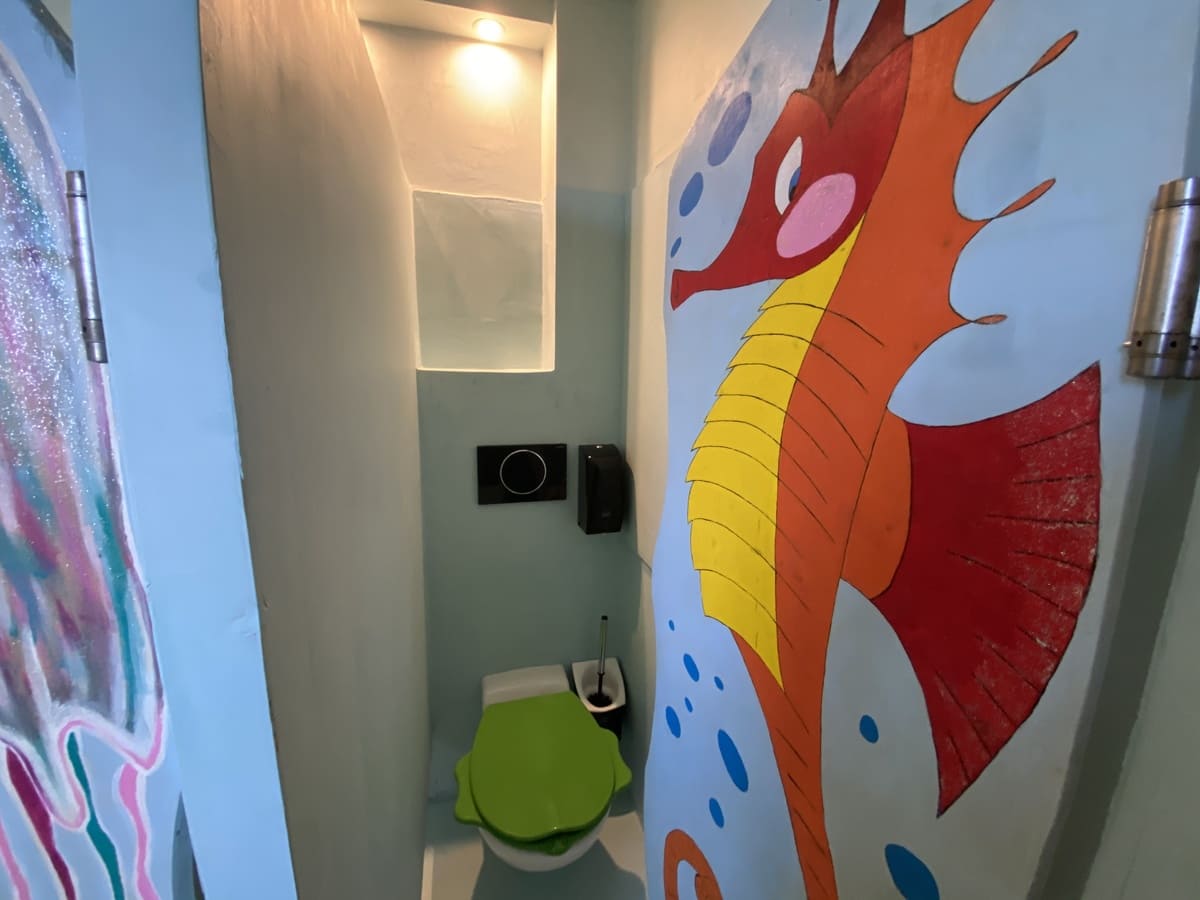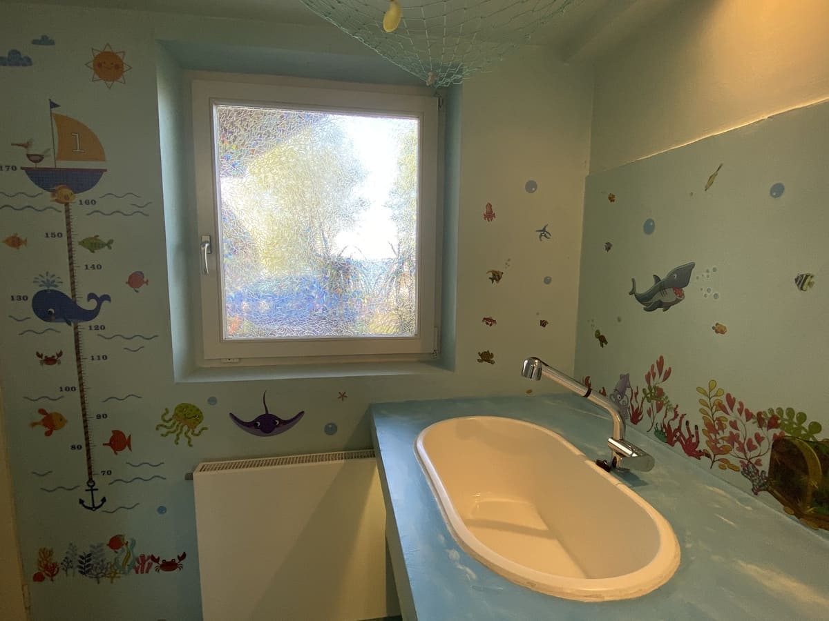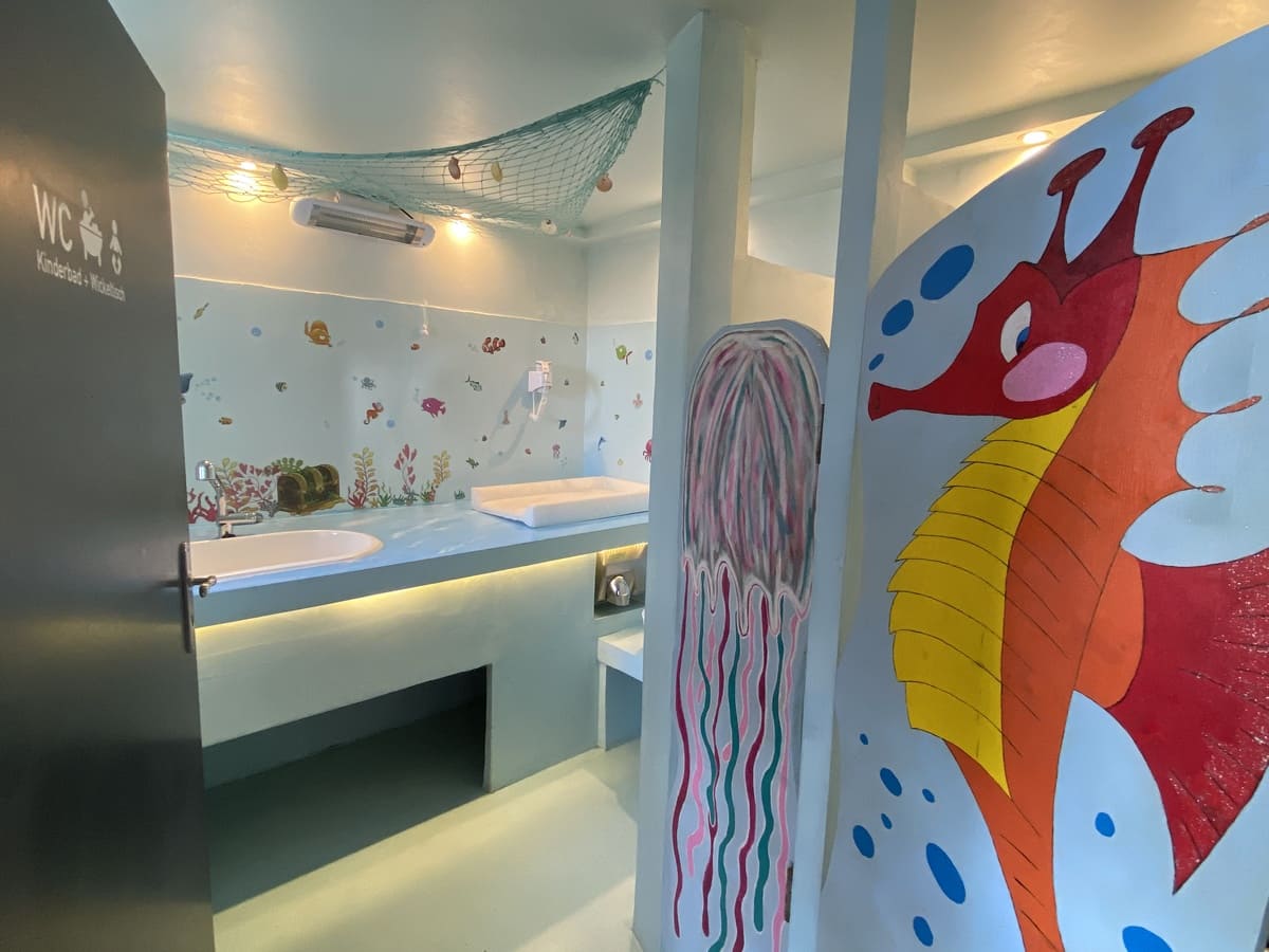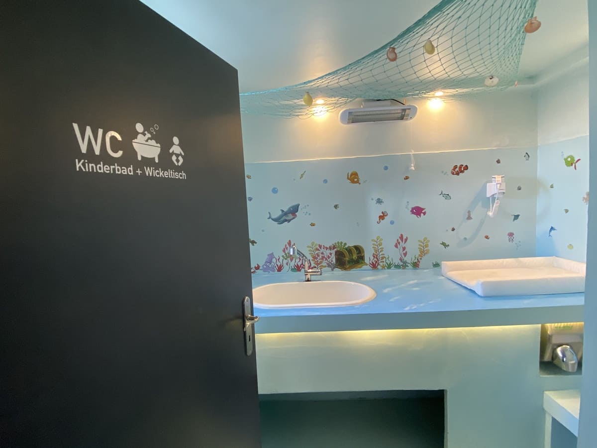 liebevoll gestaltet mit Babybadewanne, Fön, Waschbecken, Kinder-Pissoir und -Toilette, Wickeltisch, geheizt