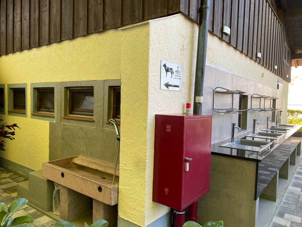 Innen- und Außenspülen, Waschmaschine und Trockner (mit Gebühr), Camping-Butler (Reinigungsautomat für Chemie-Toiletten mit Gebühr)